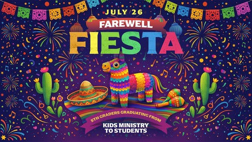 The Kids Farewell Fiesta is a special event to celebrate our rising 6th graders as they step into Student Ministry. Join us on July 26 right after church for great food, fun activities, and a joyful send-off. RSVP with the Kids Ministry team to save your spot!